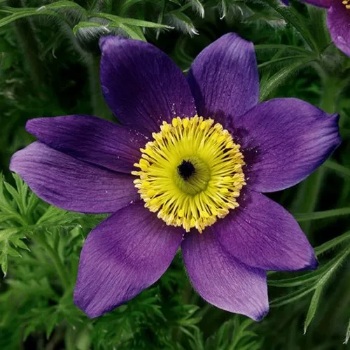 Окрас играет переливами: от насыщенного синевато-фиолетового до глубокого лилового. На солнце поверхность лепестков выглядит бархатной с лёгким глянцевым блеском, а золотисто-жёлтые тычинки внутри придают цветку яркий акцент. Центральная часть иногда переливается серебристым отливом, подчёркивая необычную цветовую палитру. Такая контрастная композиция делает прострел одним из самых эффектных раннецветущих растений.